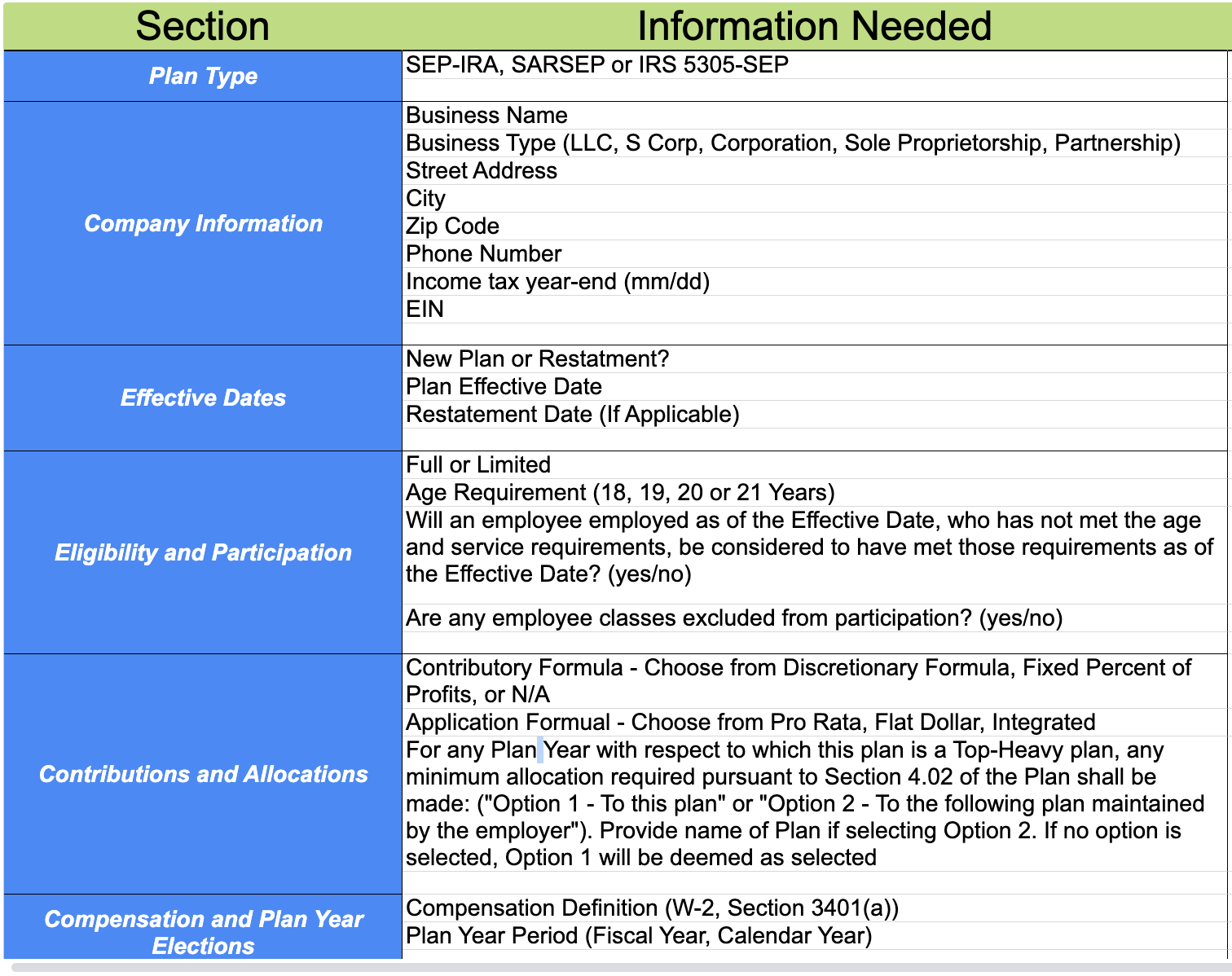 To open a SEP IRA at Schwab, the SEP IRA Application, Employer's Agreement with Schwab, and Adoption Agreement must be completed, signed, and submitted. To streamline the process for your client, we recommend gathering all the necessary information upfront. This ensures the forms are fully and accurately completed. We've provided an Excel template to help you collect the required business and plan details. Links to the full versions of the forms are also included below.