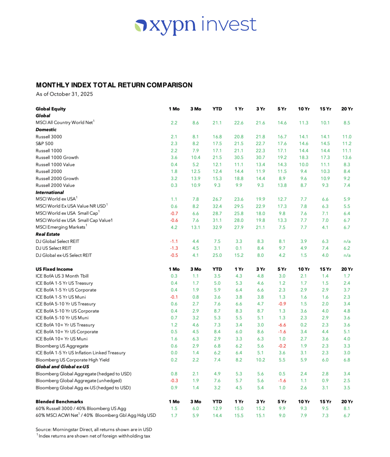 - The U.S. stock market continued its ascent (+2.1% in October, Russell 3000 index) with the leading asset class among U.S. stocks in October being large-cap growth stocks (+3.6%, Russell 1000 Growth index).
